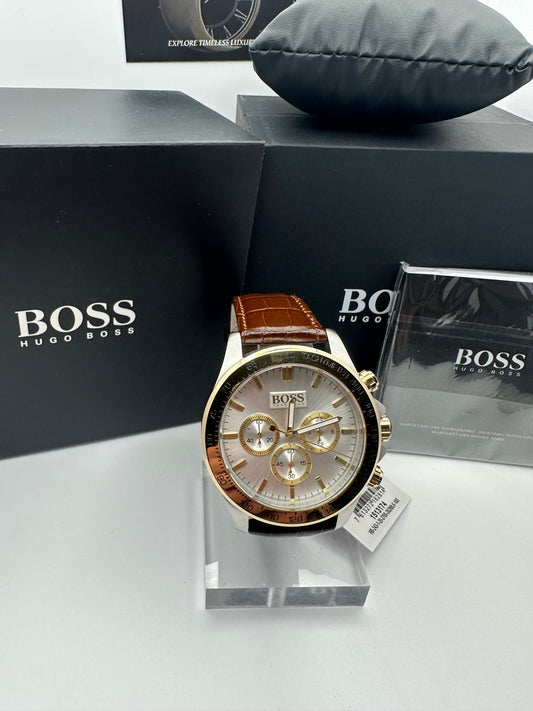 HB1513174 Ikon Gold Tone Stainless Steel Brown Leather Strap Mens Chronograph Watch