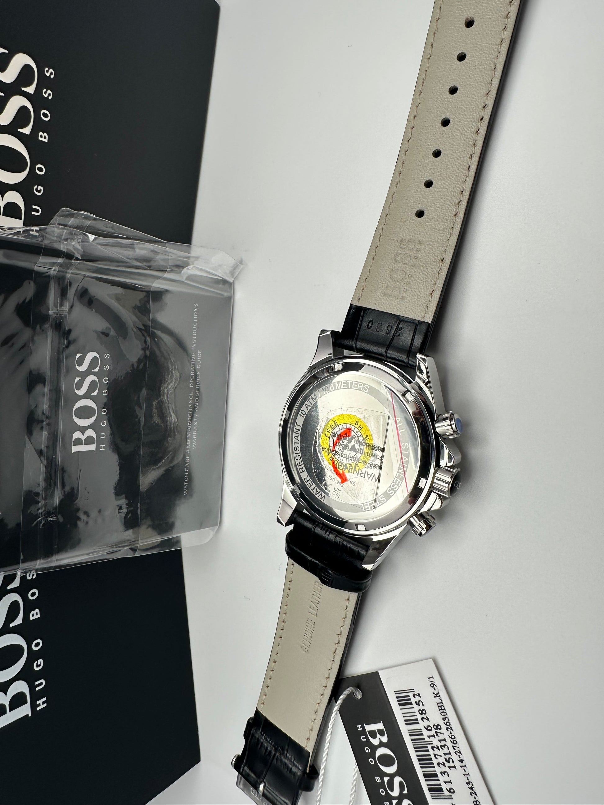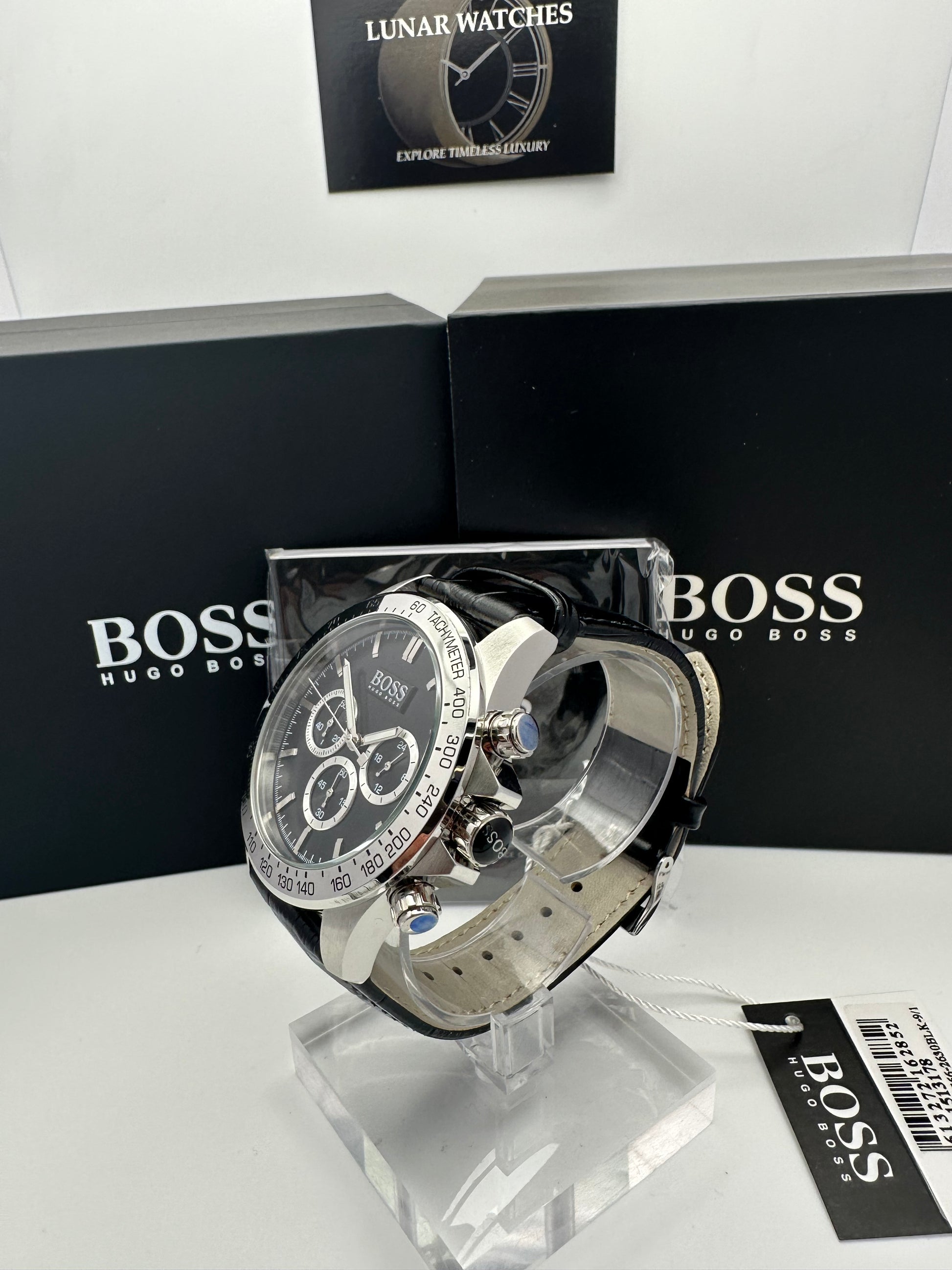 Hugo Boss Ikon 1513178 Leather Strap Black Dial Silver Tone Case Mens Chronograph Watch