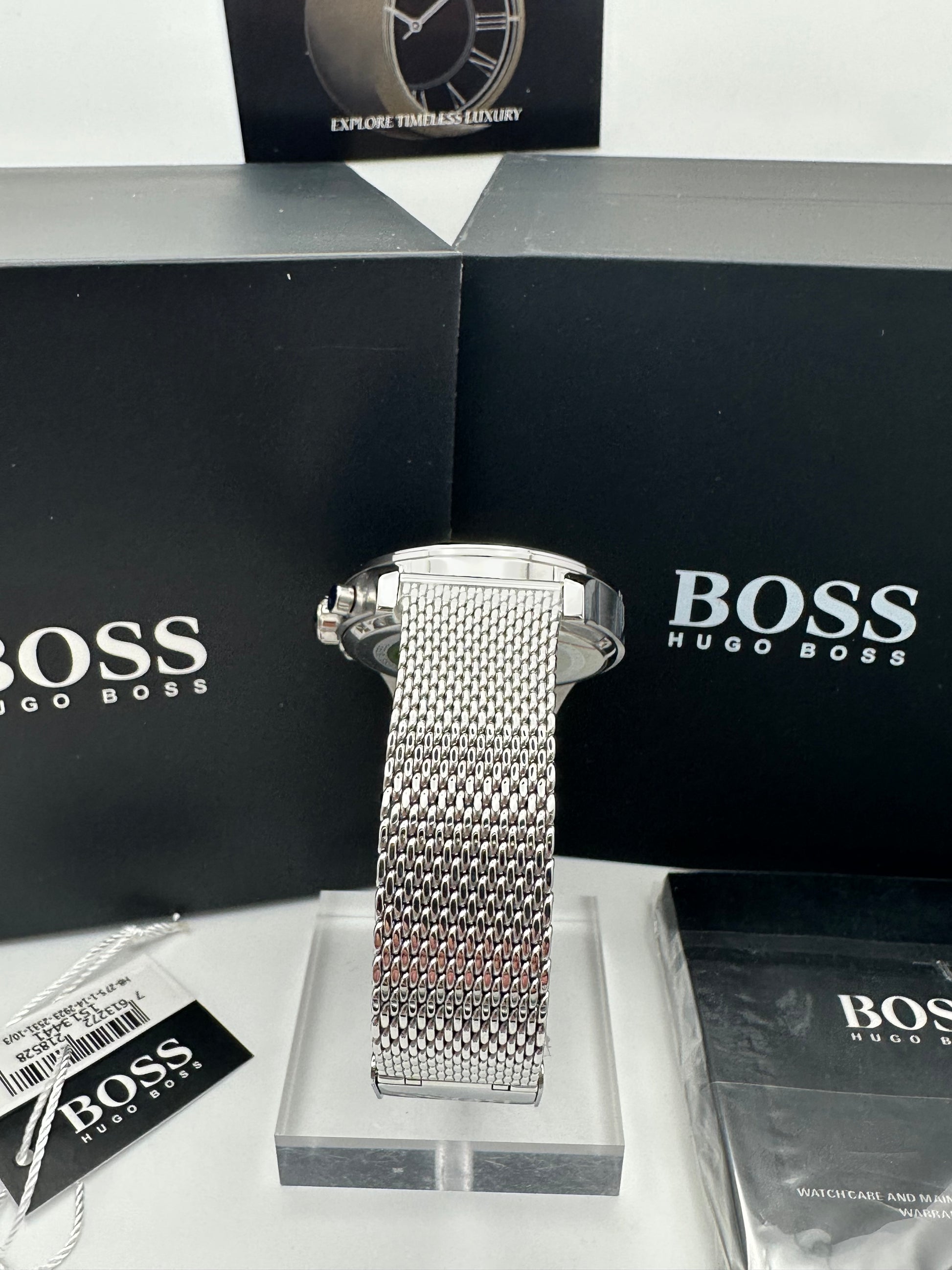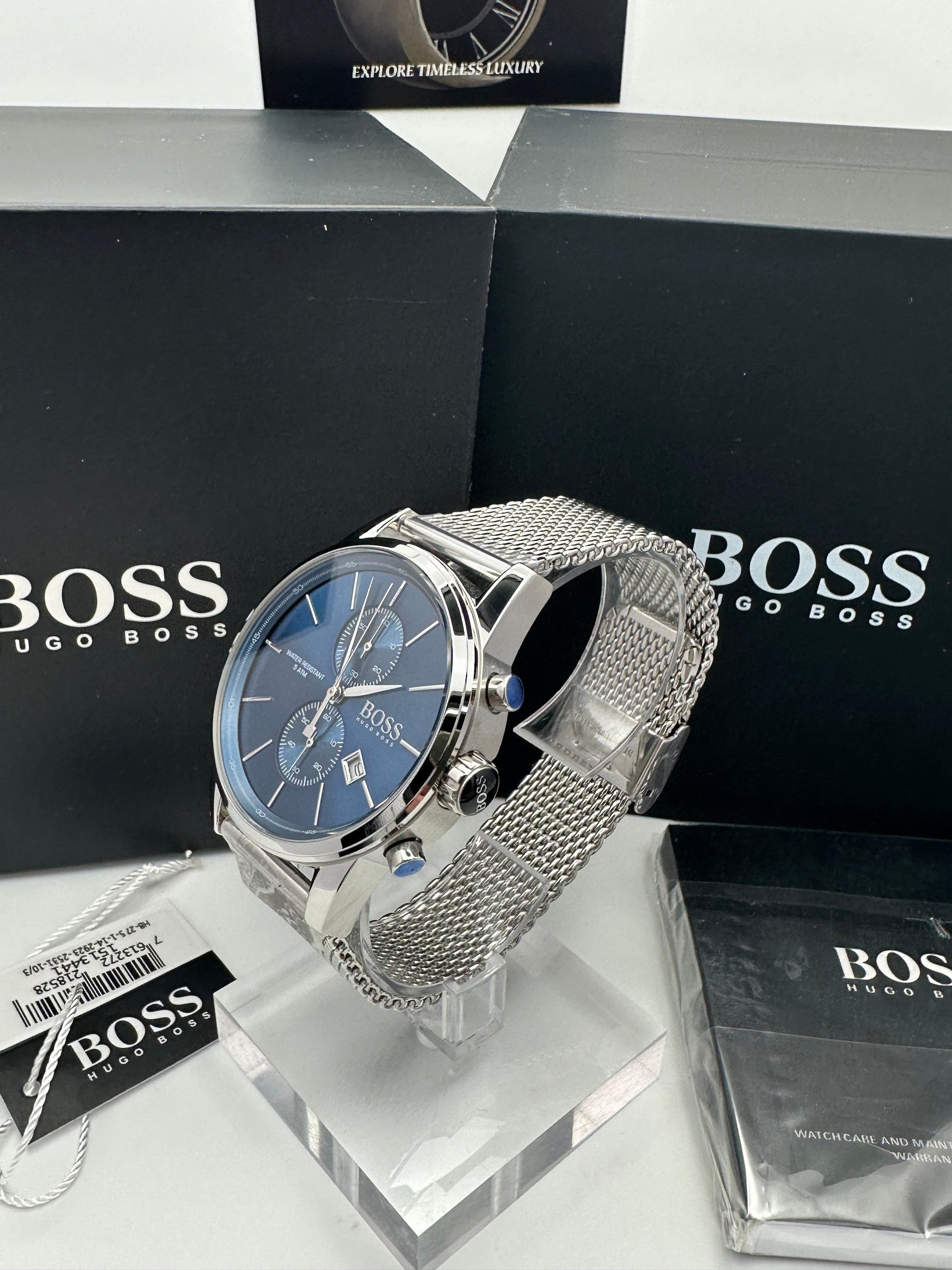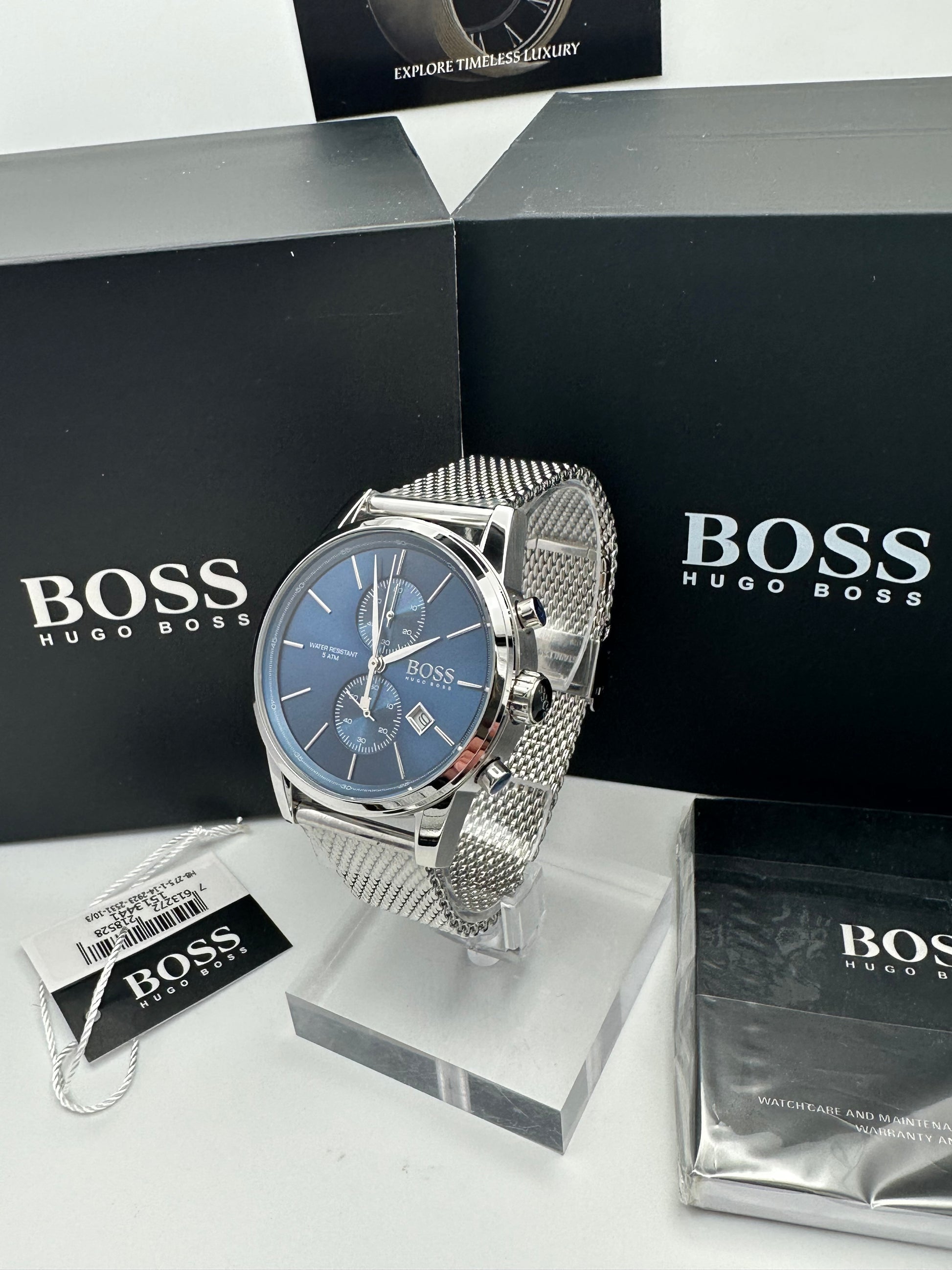 Hugo Boss 1513441 Mens Jet Chronograph Watch has a stainless steel case and is powered by an analogue chronograph quartz movement. It fastens a silver metal bracelet and has a blue dial. The watch has a date function.