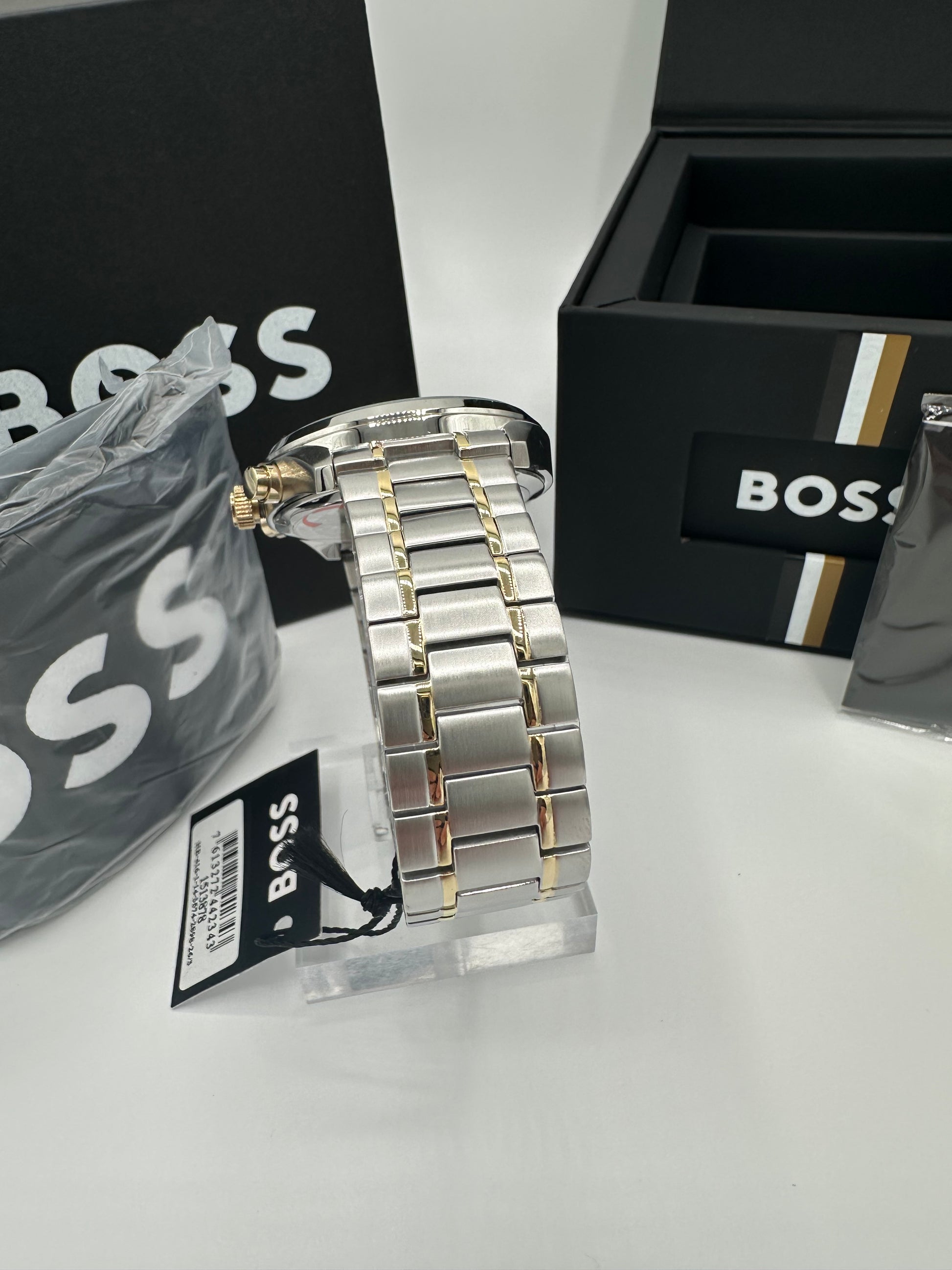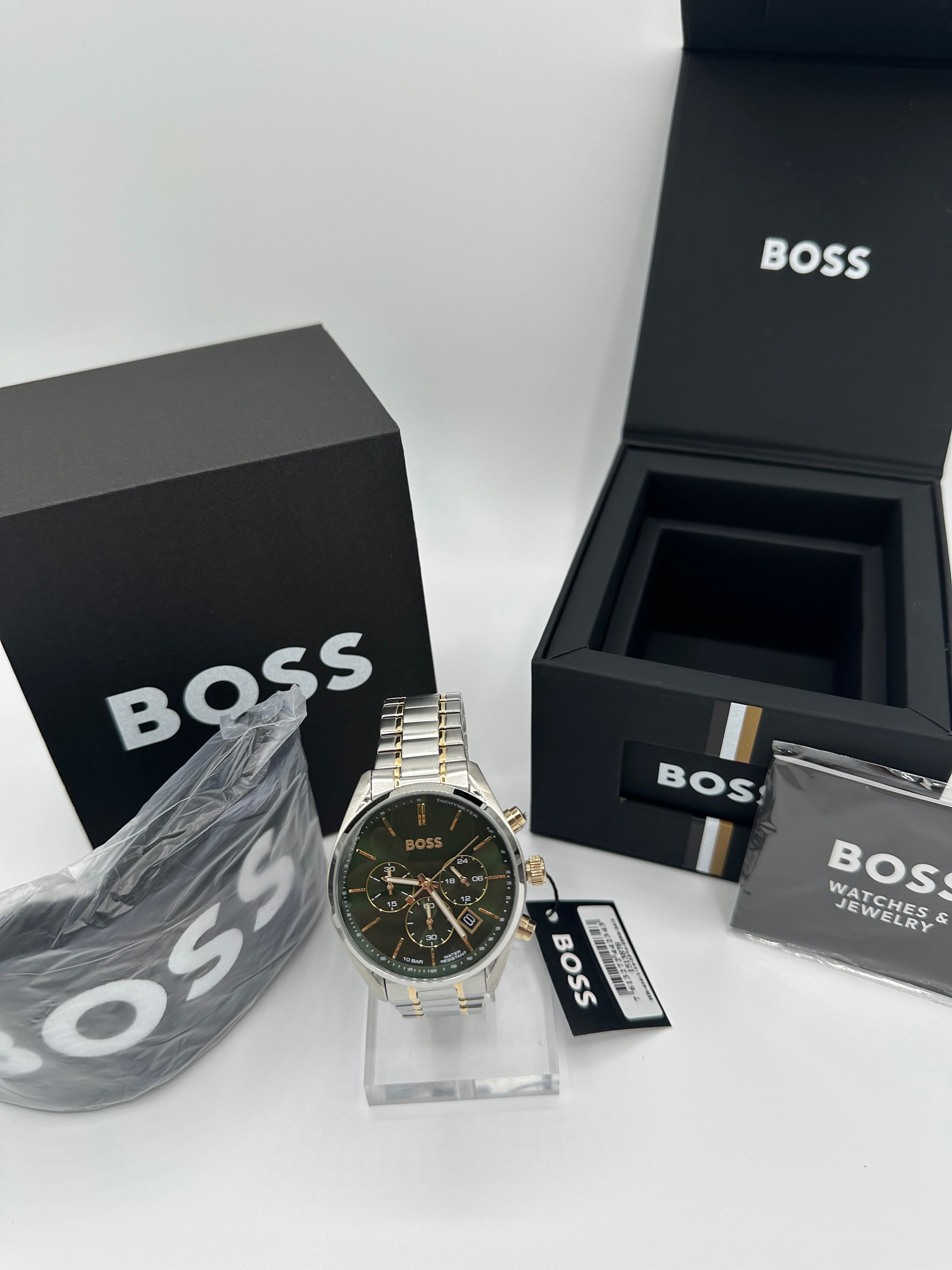 Hugo Boss HB 1513878 Mens Champion Watch. Material of the case comprises of gold PVD stainless steel and the green dial gives the watch that unique look. The features of the watch include a chronograph and date function.