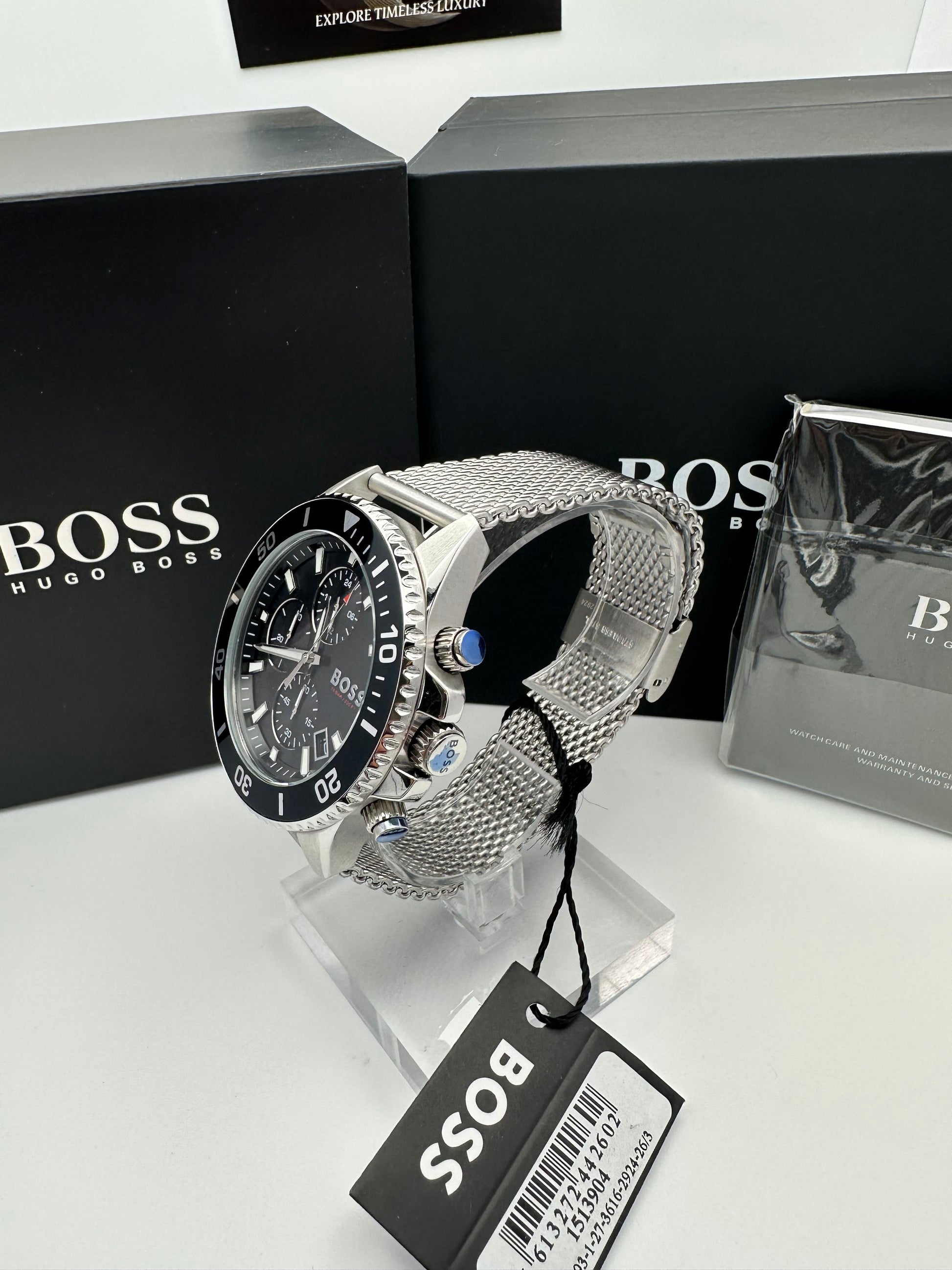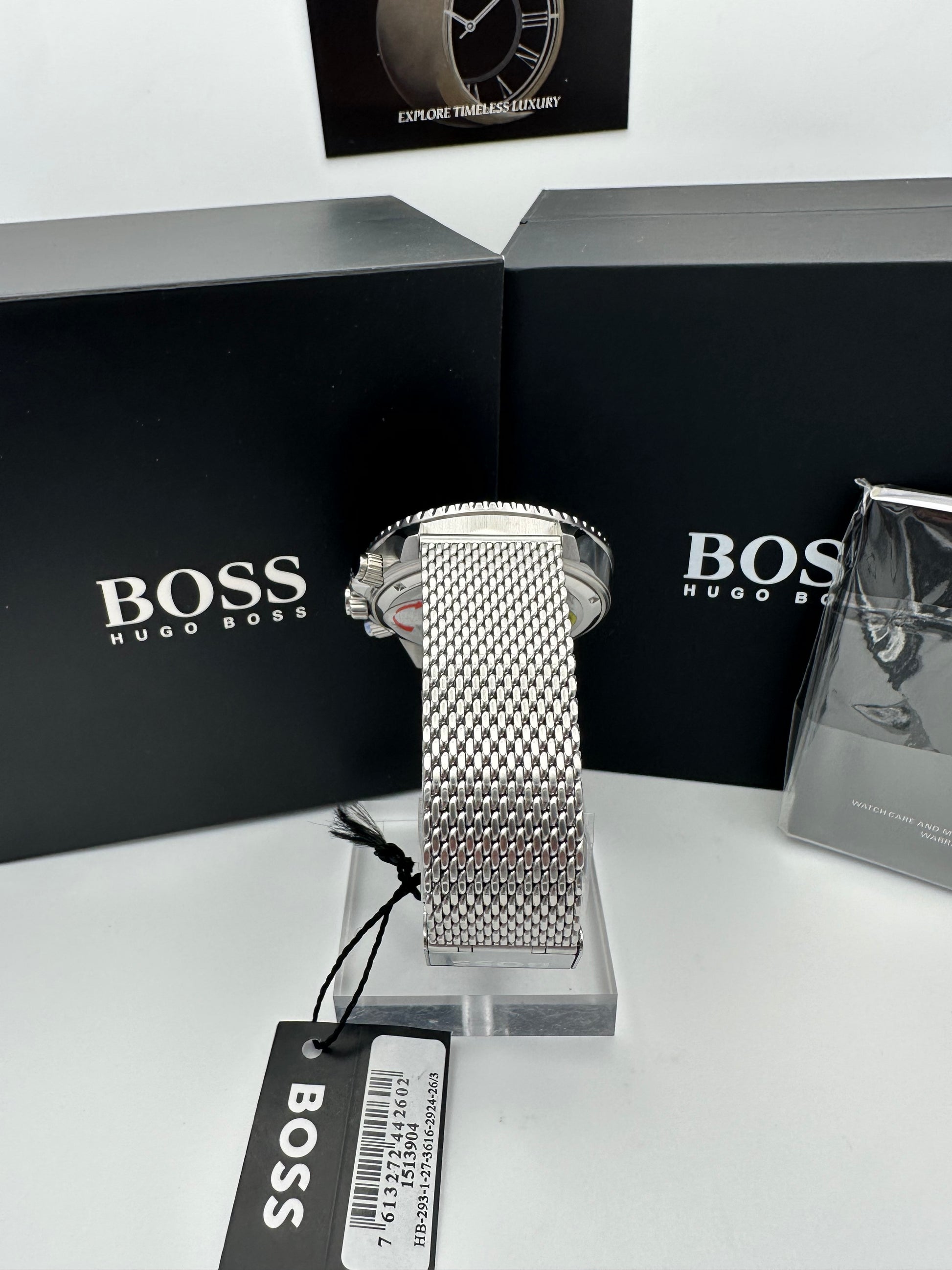 Hugo Boss HB 1513904 Mens Admiral Watch. This stylish chronograph features a 46mm stainless steel case, black rotating bezel, black dial, stainless steel mesh bracelet and flick release clasp.