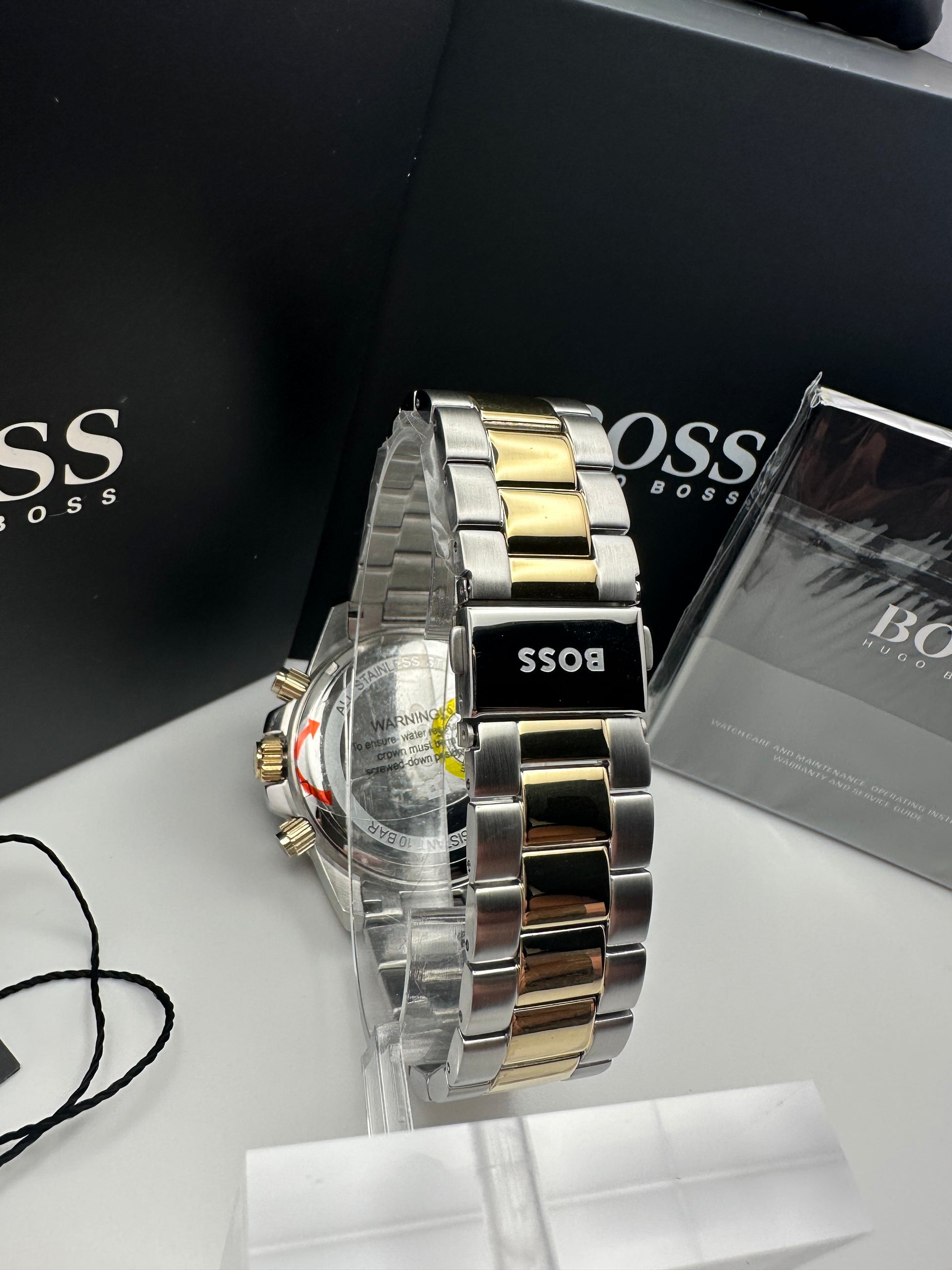 Hugo Boss HB 1513908 Mens Admiral Watch. This stylish chronograph features a 46mm stainless steel case, black rotating bezel, black dial, two tone Gold PVD stainless steel bracelet with a push release clasp.